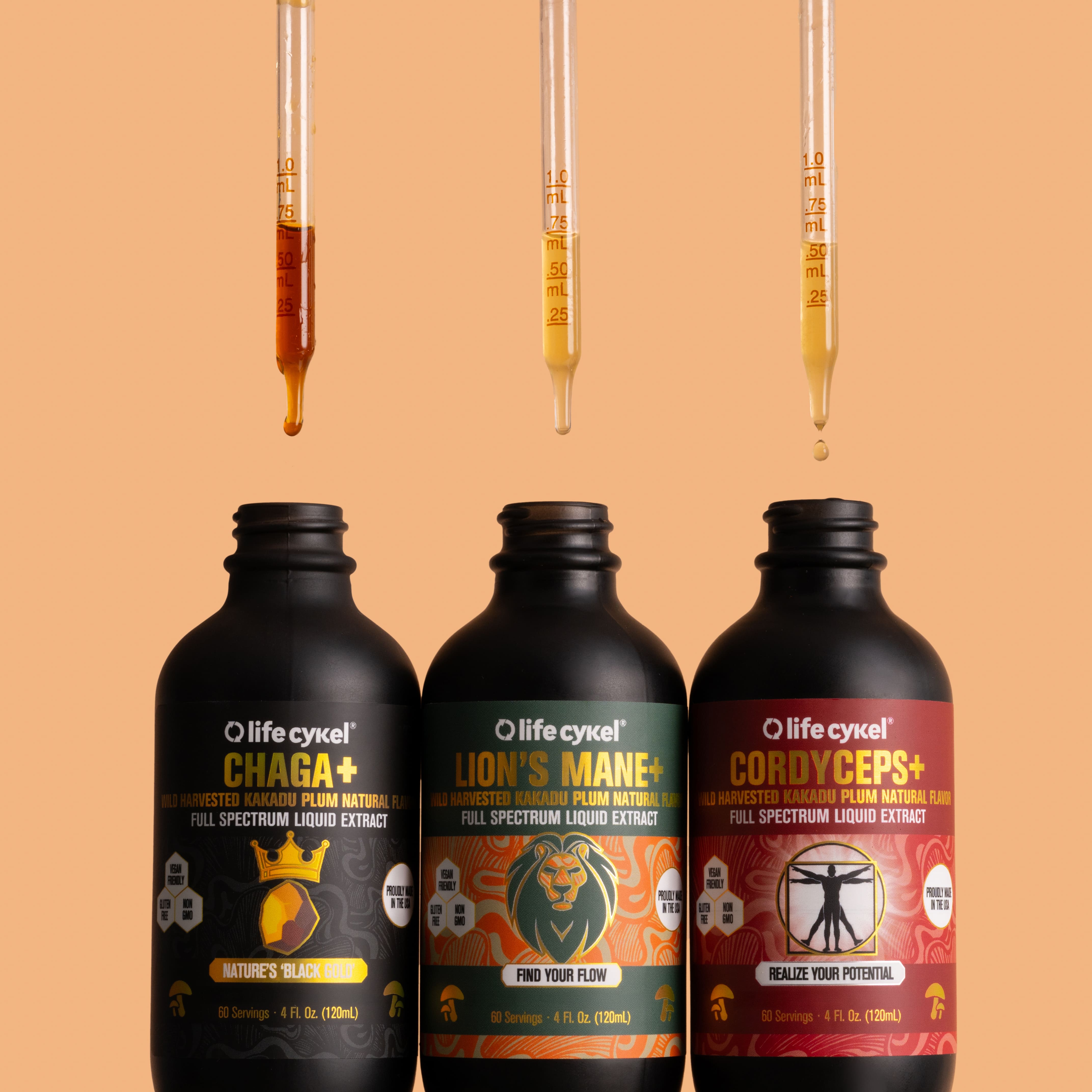 Lifecykel Cordyceps mushroom extracts  with a red label on a white background Bottle of Lifecykel Cordyceps mushroom extracts with arm and energy support icons on a white background Bottle of Lifecykel Cordyceps mushroom extracts with text highlighting features, being held by a person. Orange Cordyceps mushrooms on a light gray background with text about Australian origin and in-house extraction by scientists. Label with serving information, ingredients, and certification icons on a white background Bottle of Lifecykel Cordyceps mushroom extracts with a dropper on a white background